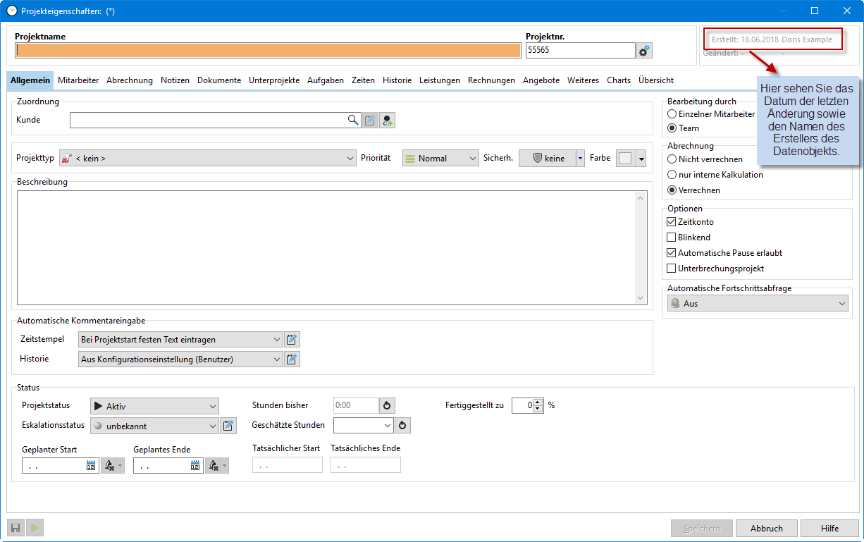 Sie können jedes Projekt einem Ansprechpartner Ihres Kunden zuordnen. Dieses Feld dient rein zur Information und bietet keine weitere Filter oder Auswertungsmöglichkeit. |