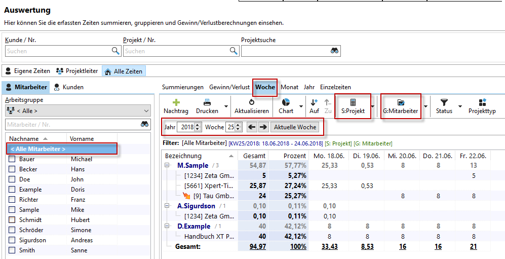 Mit der Wochenansicht erhalten Sie direkt einen Überblick über die angefallenen Projektzeiten der Woche. Die üblichen Filter und Gruppierungsmöglichkeiten stehen Ihnen zur Verfügung. Die Summierung nach Projekt und die Gruppierung nach Mitarbeiter wird eine der interessantesten Kombinationen sein.