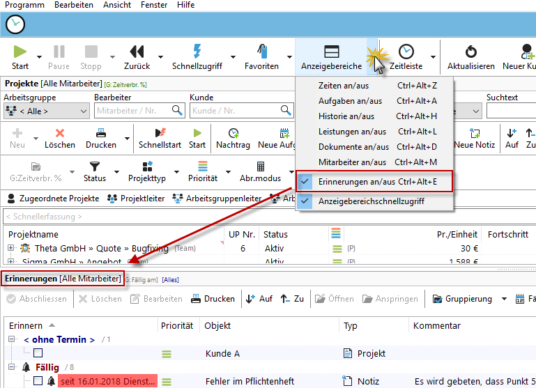 Über den Knopf "Anzeigebereiche" können Sie im Projektmanager Ihre Erinnerungen einblenden: