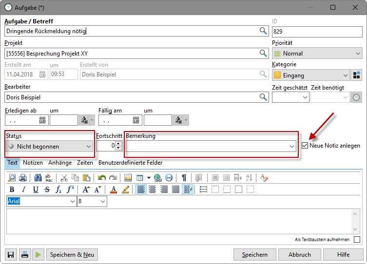 Eine Aufgabe wird erstellt und einem Mitarbeiter (z. B. "Doris Beispiel") zugewiesen. Zu Beginn steht sie im Status "Nicht begonnen". Wird der Haken bei "Neue Notiz anlegen" gesetzt, werden alle Änderungen am Status oder Feld "Bemerkung" dokumentiert.