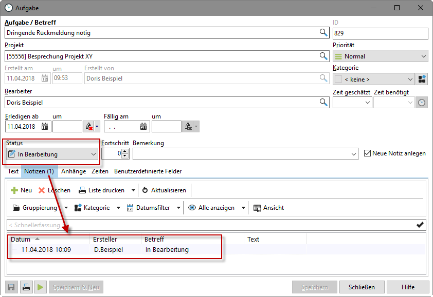 Wird der Aufgabenstatus auf "In Bearbeitung" gesetzt, wird automatisch eine Notiz erstellt. Weitere Statusänderungen (z. B. zu "Problem") oder Bemerkungen werden ebenfalls festgehalten.