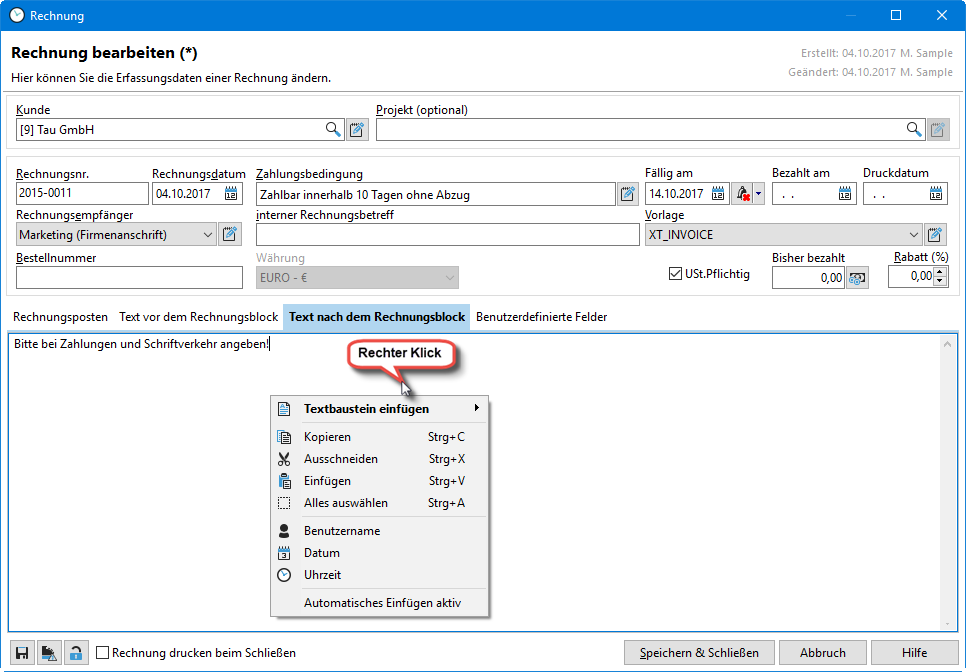 Auf Ihrer Rechnung können Sie auch nach der Auflistung Ihrer Rechnungspositionen noch einen freien Text pro Rechnung einfügen. Hier können Sie auch von Ihnen definierte Textbausteine nutzen.