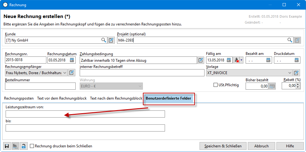 In der Rechnungsstellung können Sie benutzerdefinierte Felder anlegen, die Ihnen dann in Ihrer Rechnungsvorlage zur Verfügung stehen. Bitte beachten Sie, dass Ihre selbst angelegte Rechnungsvorlage nicht automatisch mit den neuen Feldern bestückt wird. Sie müssen diese Felder selbst in der Datenbankabfrage und auch in Ihrem Report einbinden. Eine Anleitung dazu finden Sie hier.