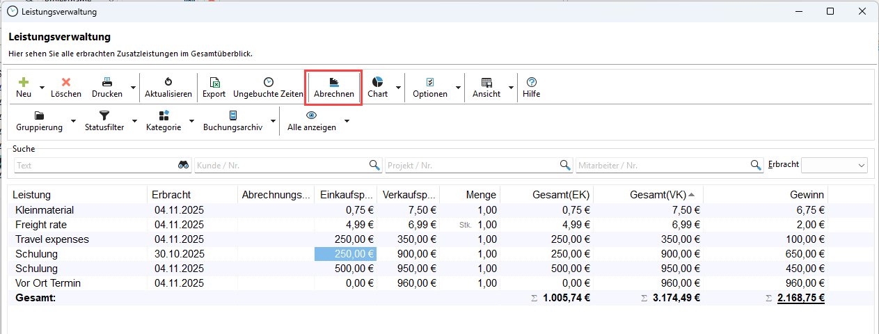 3.Erfassung von mehreren Leistungen während der Laufzeit des Projekts und Abrechnung dieser Leistungen über die Leistungsverwaltung, z.B. am Ende des Monats. Über das Menü "Fenster" und den Unterpunkt "Leistungen / Kosten" gelangen Sie zum Dialog "Leistungsverwaltung". Hier wählen Sie dann die entsprechenden Leistungsposten zur Abrechnung aus.