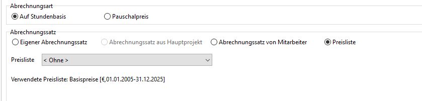 Dem Hauptprojekt wird die Preisliste entnommen. Damit greift bei Einstellung "Aus Preisliste" -> "Ohne" die dem System in der Konfiguration als "Standardpreisliste" hinterlegte Preisliste. Das ist im Beispiel die Liste "Basispreise".