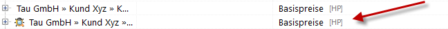 In diesem Fall wird die Preisliste des Hauptprojekts verwendet. Das wird auch mit einem [HP] (Hauptprojekt) in der Spalte Preisliste im Projektmanager angezeigt.
