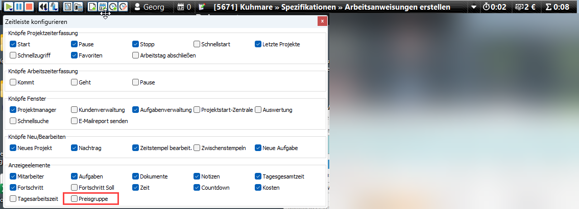 Dazu klicken Sie mit der rechten Maustaste auf einen der Buttons in der Zeitleiste und wählen dann das Anzeigeelement "Preisgruppe".