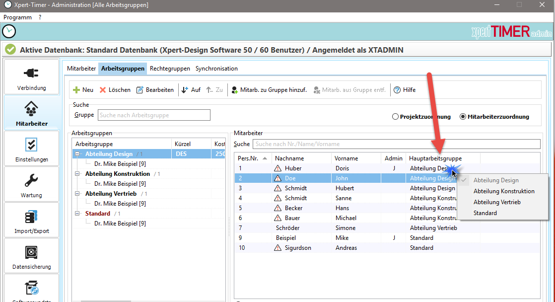 Erstellen Sie im Bereich "Mitarbeiter" die entsprechenden Mitarbeitergruppen und weisen Sie die Mitarbeiter per Drag&Drop zu den erstellten Arbeitsgruppen hinzu.