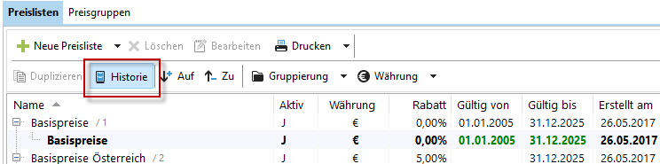Preislisten können ein Ablaufdatum haben. Setzen Sie dazu das Datum bei "Gültig bis".